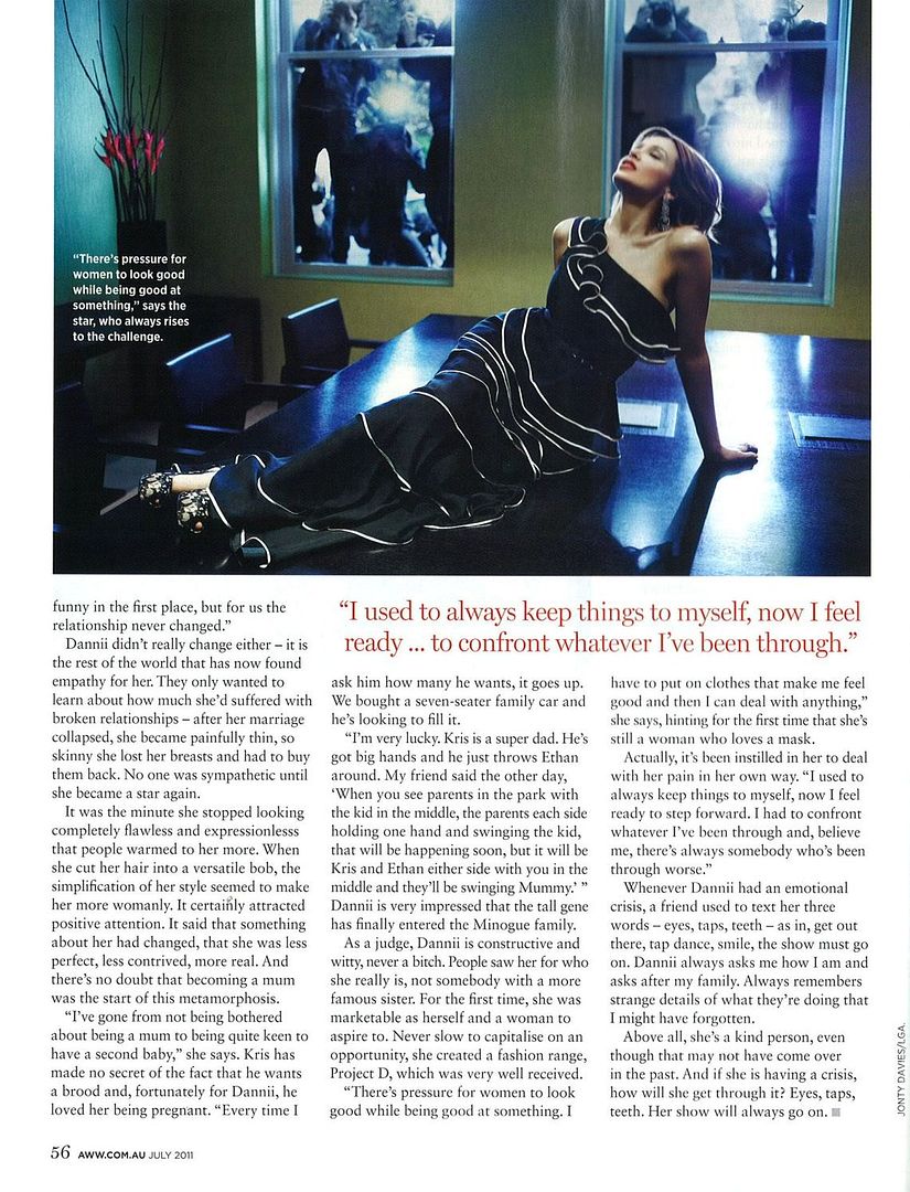 A revista traz uma matéria especial sobre a metamorfose ocorrida na vida e na carreira da Dannii nos últimos quatro anos - desde sua entrada no X Factor (em 2007) e o início de seu relacionamento com Kris Smith até o lançamento de sua grife e o nascimento de seu primeiro filho, Ethan.